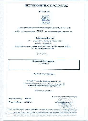 Sinds 1997 the Greek farmer Jannis Taleporou cultivates his soil with biological-organic methods that are controlled continuously since 1999 by DIO, an officially and European recognized organisation.